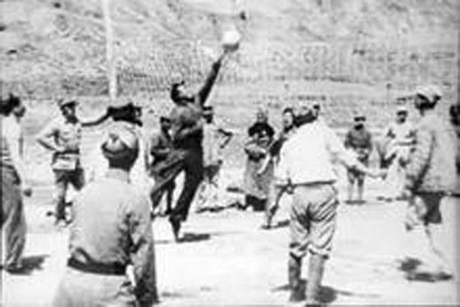 贺老总有三宝:亚五亚六(指358旅715、716团)、战斗篮球队和战斗剧社。”有的说:“120师有三好。仗打得好,球打得好,戏演得好。”本文要讲的故事就是一场篮球赛。通过这场有趣的篮球赛,我们可以看出贺老总对篮球的喜爱和他的智慧、诙谐和幽默。 l938 年,“五一”国际劳动节前,晋绥边区组织了一次规模空前的篮球大赛。当时,各部队、各民兵队都挑选了劲旅参赛。有一天,阎锡山的71师篮球队也派人报名参赛。比赛组织者将这一情况向贺龙作了汇报,贺龙爽朗地说:“好啊,国共合作,搞统一战线,我们欢迎!”71师是阎锡山的主力部队,篮球队装备好,运动衣、球鞋都是从南京等地买来的,队员个个人高马大,来势汹汹,丝毫没有把八路军、民兵参赛队放在眼里。120师“战斗篮球队”是在1938年初由贺龙同志倡导组建的,由于日军对晋西北疯狂的封锁和破坏,根据地军民生活极其困难,不但买不到体育器材,就连衣服、鞋袜都是自己缝制的。队员们用的篮球,是通过内线从敌占区购买的,篮圈和篮球架则是把铁匠打的圆圈圈钉在木板上,再用几根榆木柱子立起来就制作成功了。球鞋是服装厂用胶皮缝制,两边打眼,绳子绑在脚上就是球鞋。参赛的各个民兵队更是土打土闹,身着粗布衣,脚穿“碰山鞋”,根本不像运动队的妆扮。