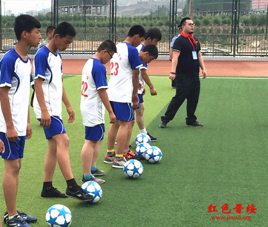 阿根廷籍足球教练郝尔海·瓦伦西亚(右4)在“一二〇”师学校为孩子们进行足球指导。右2为本文作者、基金会志愿者段翔,右3为马拉多纳国际足球俱乐部总经理毕智峰,右5为120师学校足球队教练王慧东老师。