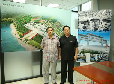 晋绥儿女、捐款人郝晓峰(左)与基金会副理事长兼秘书长段晓飞在晋绥烈士陵园绿化效果示意图合影留念。