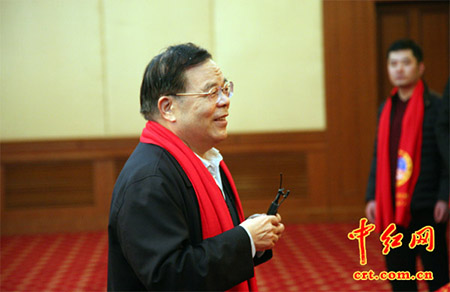 青年革命后代卢晓向周总理亲属赠送书法作品。(中红网李学叶摄)