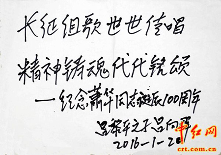 吕黎平少将之子吕向群题词:“长征组歌世世传唱,精神铸魂代代铭颂。”(中红网红色图库)