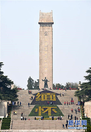 这是雨花台烈士纪念碑前布置的“缅怀”花坛(3月27日摄)。近日,为迎接清明节,南京雨花台烈士陵园的烈士纪念碑前布置了由数万盆鲜花组成的“缅怀”花坛。许多市民、学生和外地游客来到这里参观凭吊,缅怀革命先烈。新华社记者 孙参 摄