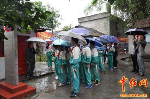 中红网四川都江堰2016年5月23日电(林超)“红色教育一定要从娃娃们抓起!”5月22日,天空尽管瓢泼大雨下个不停,但是,都江堰市北街小学五年级(1)班的28名孩子仍然在家长的陪伴下,来到位于城郊结合部的青少年爱国主义教育基地——长征书院,首次开展主题为“学光荣传统,做红色传人”的亲子红色教育体验活动。