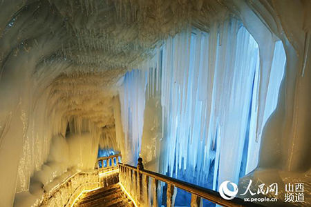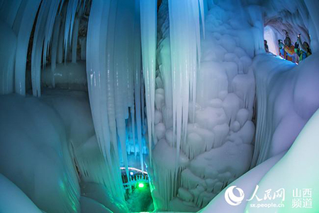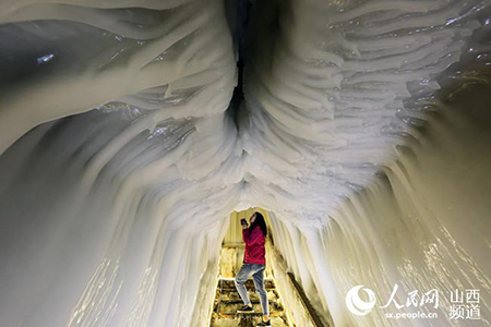 洞内温度恒定在零下4-10度,积冰常年不化;冰洞内冰笋、冰柱、冰锥、冰葡萄等随处可见,冰的形状千姿百态(王权 摄影)