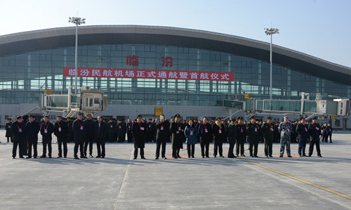 临汾市委、市政府、市人大、市政协领导和驻临媒体、社会各界人士正在参加首航仪式。