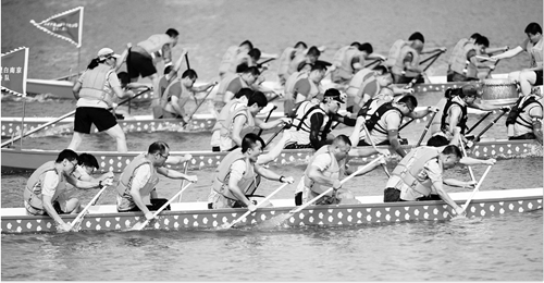 8月6日,龙舟运动员正奋力划向终点。当日,2016太原汾河龙舟公开赛在省城汾河景区拉开帷幕,共有来自全国12支专业龙舟竞赛队伍的300多名运动员参赛,其中我省有6支代表队。在为期2天的比赛中,12支代表队将进行12人标准龙舟200米直道竞速、500米直道竞速两个项目的冠军争夺。当日的比赛吸引了众多省城市民前去观赛助威。 本报记者 李兆民 王玉宾 摄影报道