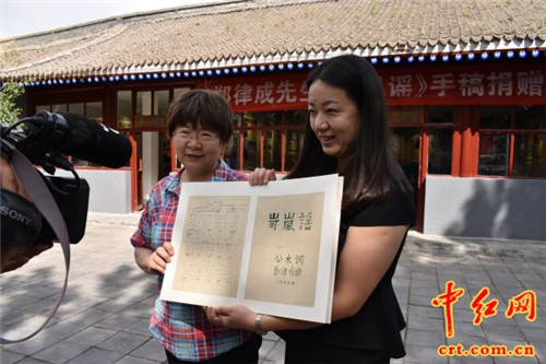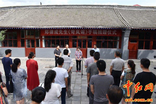 8月8日下午,人民音乐家郑律成之女郑小提向山西省忻州市岢岚县博物馆捐赠父亲郑律成谱曲的《岢岚谣》手稿。图为捐赠仪式现场。(中红网布铁威摄)