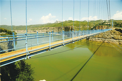站在大坝北端百余米高的铁索桥上望上一望,黄色的河水变绿了,平静的水面常有鱼儿跃出。晋陕大峡谷里,黄河水分开了高低的层次。她正用磅礴的力量,穿过坝底,推动发电机组,又把自己化作电流,传送给千家万户,为他们带去光明。眼前的大峡谷再无阻碍,眼见着黄河奔腾而去,她又将为下游的人们送去她无私的爱。